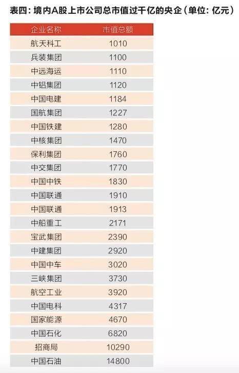 央企的上市公司市值情况差异极大,从二十亿元到过万亿元不等,差距高达数千倍。