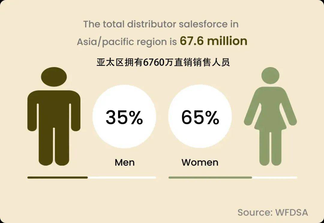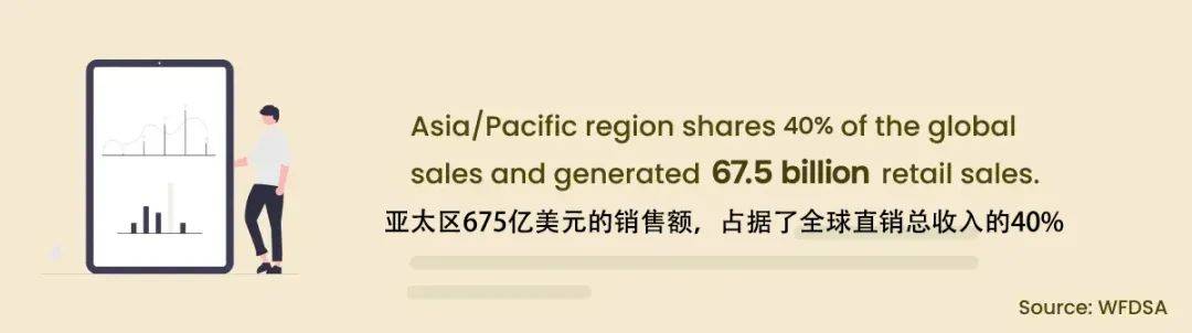 世界直销协会联合会(WFDSA)的年度报告显示,亚太区占全球直销总收入的比例达到了40.3%。随着亚洲顶级直销公司利用数字化和人工智能技术,为客户提供更激动人心和更令人兴奋的消费和创业体验,亚太区直销在全球的占比还将不断扩大。