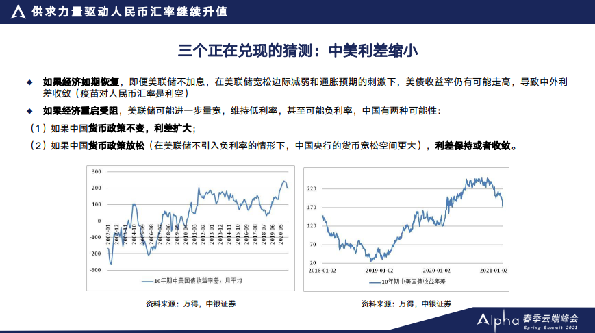比方说中美利差比较大,被市场认为是吸引外资流入,支持人民币升值的一个重要因素。但在今年年初的时候我就说了,去年中美利差比较大,有一定的特殊性,今年的话在基准情形下,随着疫情得到控制,即便美联储不会马上加息,但是通胀预期抬头也可能会推高美债收益率,并导致中美利差收敛