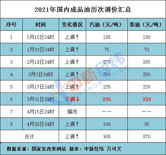 据中新经纬客户端统计,此前,国内成品油在今年已历经八个调价窗口,如果此次价格上调落实,2021年成品油调价将呈现“七涨一跌一搁浅”的格局。