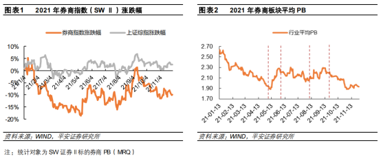 回顾2021年,全年券商板块平均PB在1.90-2.60之间波动,截至2021年11月30日,2021年券商指数(SWⅡ)下跌10.01%,较上证综指超额亏损12.63pct,行业平均估值仅1.93倍PB,处于历史前10%低位。