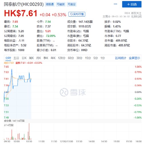 截至发稿,国泰航空股价为7.61港元/股,总市值为490亿港元。