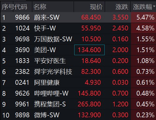 不过,开盘后恒指由涨转跌,截至发稿仅恒生科技仍维持一定涨幅,蔚来大涨超5%,快手涨近5%。