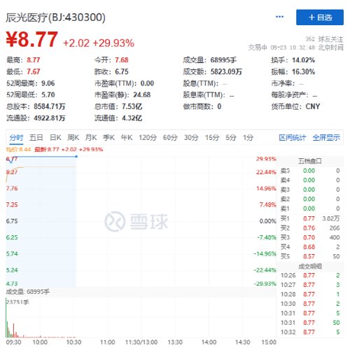 值得关注的是,上午北交所的辰光医疗,在开盘一分钟内拉出30CM涨停,当前股价8.77元/股,成交额5818万,总市值7.5亿元。