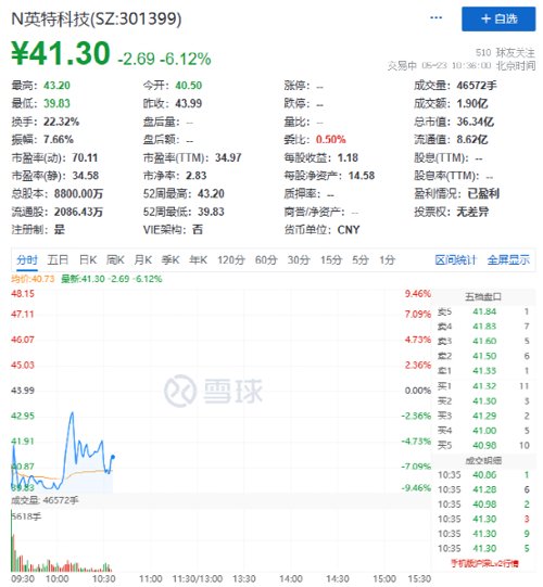 英特科技上午走势同样不乐观。英特科技发行价格43.99元/股,发行市盈率为38.83倍。上午开盘价为40.50元,跌幅7.93%。截至发稿跌幅收窄至6%,