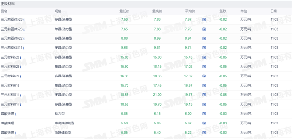 证券之星新能源车行业周报:据上海有色网,本周五SMM磷酸铁价格为1.17-1.23万元/吨,均价1.20万元/吨,较上周五跌100元/吨。本周,磷酸铁价格下跌。因下游订单变数较大,磷酸铁月度谈单较谨慎,为获得市场份额,磷酸铁厂被迫让“利”出售。本周,原料价格稳定,企业生产成本稳定,相对销售价格,成本高企。原料端,磷酸铁按需生产,新产线集中在年底前调试完毕,市场供应量充足。需求方面,四季度需求惨淡,对磷酸铁的需求量有所减少。随着月度谈单的结束,散单的成交亦趋于平淡,预计,下周磷酸铁价格持稳。