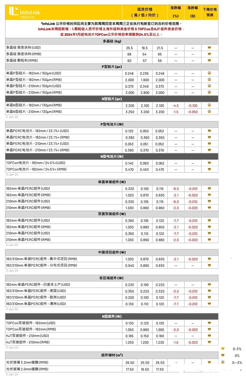 电池片生产环节在2023年末经历长达两个月的亏损后,价格来到底部横盘,M10 P型电池片在厂家大幅的减产与关停中,当前供需关系明显得到修复与改善,价格缓缓止跌甚至厂家开始出现尝试挺价的动作,尽管是否为底部转折点仍言之过早,依然给予生产厂家对于后势的一定信心。