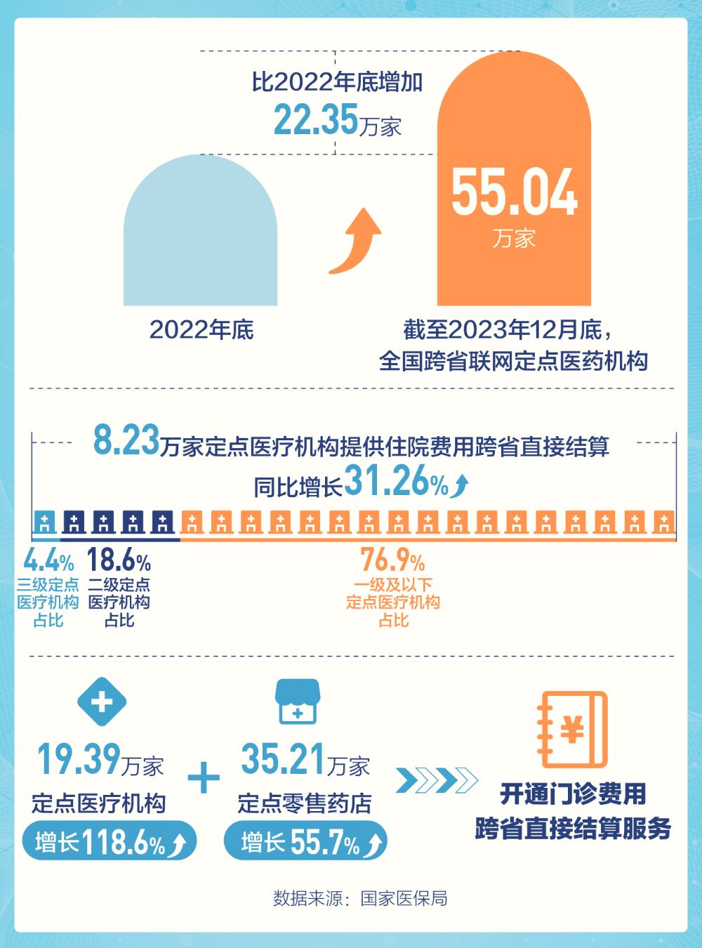 据国家医保局统计,2023年,全国跨省联网定点医药机构突破50万家,全国跨省异地就医直接结算达到1.3亿人次,为群众减少垫付1536.7亿元,较2022年同期分别增长68.4%、238.7%、89.9%。2023年住院费用跨省直接结算率预计超过70%,提前两年完成“十四五”全民医疗保障规划量化指标任务。