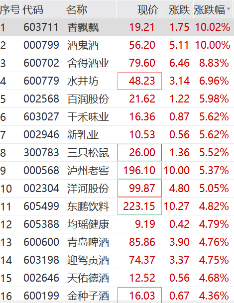 在白酒股的带动下,食品饮料板块多股冲高,香飘飘冲上涨停、东鹏饮料、百润股份、三只松鼠、千禾味业等多股大涨。