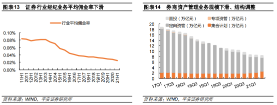 资产管理业务方面,近年来,券商的资产管理规模在逐年下滑,截至21H1,证券公司资产管理业务规模下滑至8.34万亿元。但券商持续调整资管业务结构、增加主动管理规模,进行主动转型。