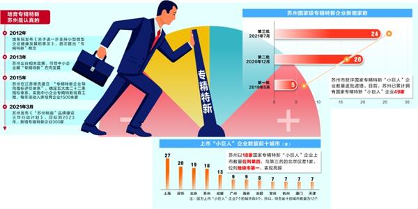 工信部今年7月公布的第三批国家专精特新“小巨人”企业中,苏州共有24家企业入围。苏州市工信局数据显示,目前,苏州已累计拥有国家专精特新“小巨人”企业49家,江苏省专精特新“小巨人”企业247家,均位列江苏全省第一。此外,苏州以18家国家专精特新“小巨人”企业上市数量位列全国第四,与第三名的北京仅差1家,位列地级市第一。