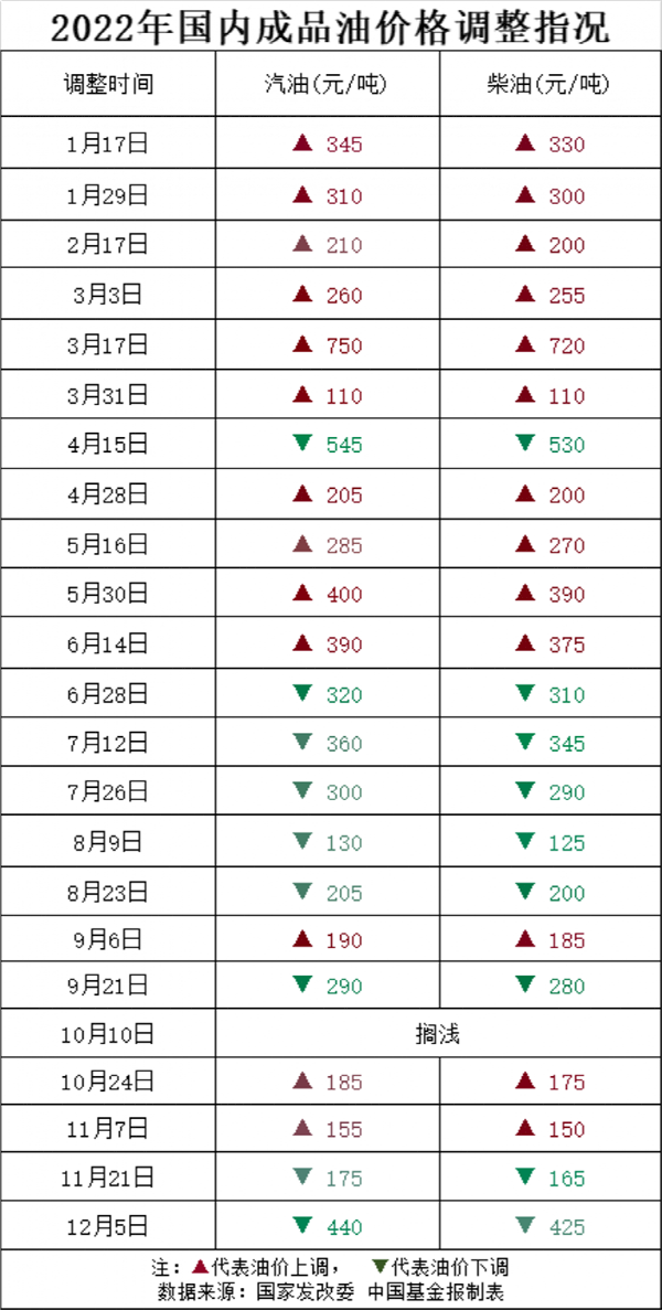 按照成品油价格调整机制,10个工作日为一个调价周期。据机构测算,截至12月16日第九个工作日,参考原油品种均价为76.76美元/桶,变化率为-6.84%,对应的国内汽柴油零售价下调460元/吨,超过下调红线。折合每升计算,预计汽油、柴油每升下调0.34元-0.38元/升。