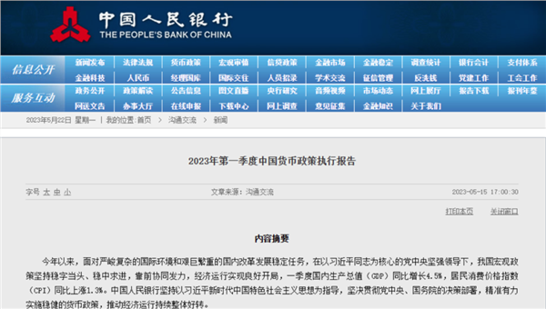 5月15日,央行发布今年第一季度货币政策执行报告。其中提出,稳健的货币政策要精准有力,总量适度,节奏平稳,搞好跨周期调节,保持流动性合理充裕,保持货币供应量和社会融资规模增速同名义经济增速基本匹配。