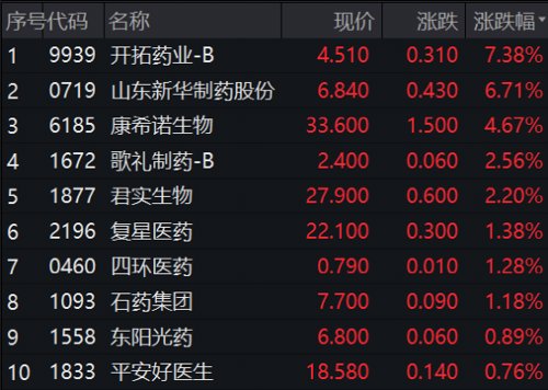 港股抗疫概念同样强势,开拓药业、山东新华制药股份、康希诺生物等涨幅居前。