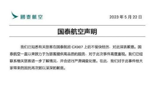 5月22日晚间,国泰航空发布声明称,已知悉有关旅客在国泰航班CX987上的不愉快经历,对此深表歉意。