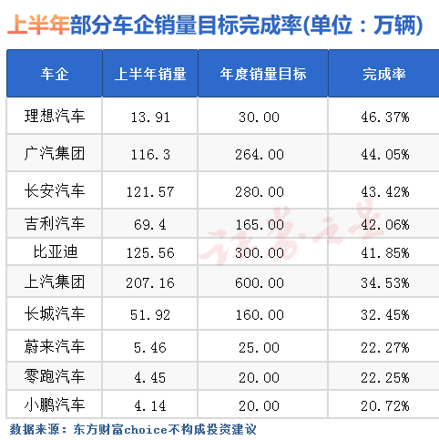 上半年车企销量完成率普遍偏低