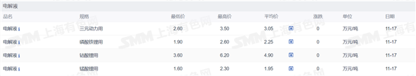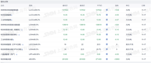 证券之星新能源车行业周报:据上海有色网,截止11月17日,电池级碳酸锂14.05-15.35万元/吨,均价14.7万元/吨,环比上一工作日下滑0.05万元/吨;工业级碳酸锂13.55-14.3万元/吨,均价13.93万元/吨,环比上一工作日下滑0.07万元/吨。近期上游盐厂依然挺价出售散单,但整体成交寥寥,现货成交价格延续下行趋势。此外,近期部分正极端企业出售碳酸锂原料库存,叠加近期锂盐集中到港,均使锂盐供应端增量明显,市场短期以降低库存为主。