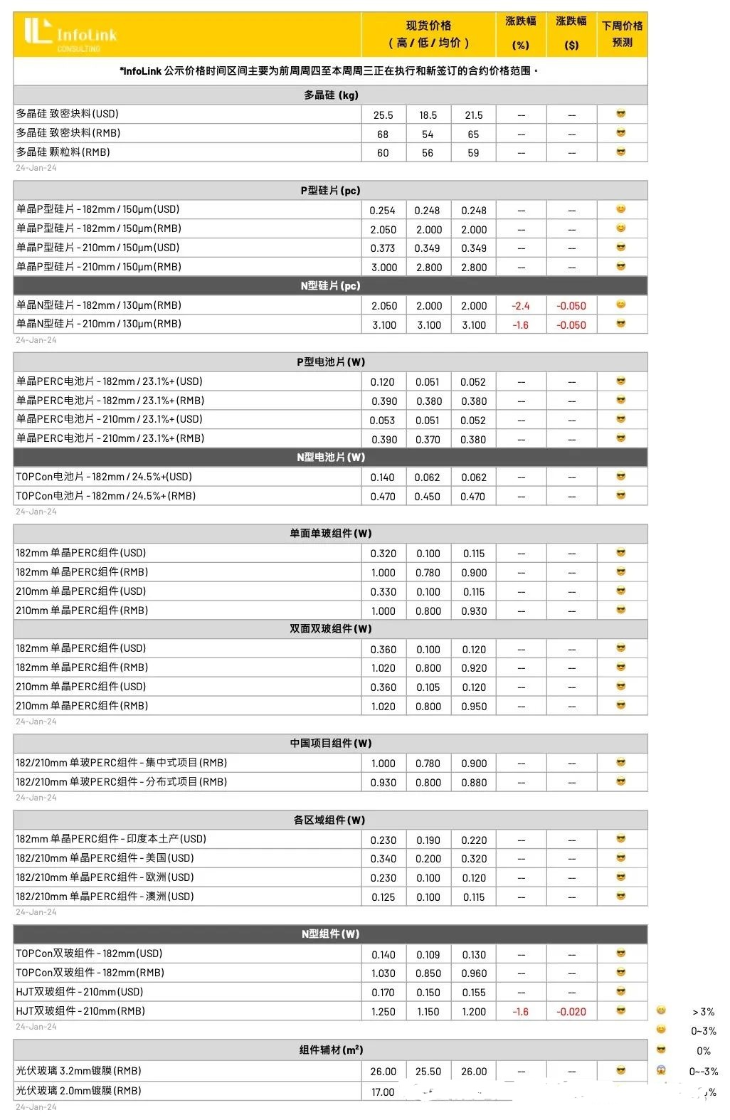 HJT价格因成本因素、且市场尚未明显打开,价格也受前单签订执行价格较高,与新单分化明显,目前国内价格约每瓦1.15-1.25元人民币之间,海外订单价格僵持在每瓦0.150-0.170元美元。
