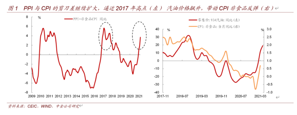 3月PPI与CPI的剪刀差继续扩大,达到2017年的高点。中金分析认为剪刀差扩大表明上游的涨价导致下游企业利润被大幅挤压,因此4月8日的金稳委会议提出,要保持物价基本稳定,特别是关注大宗商品价格走势。